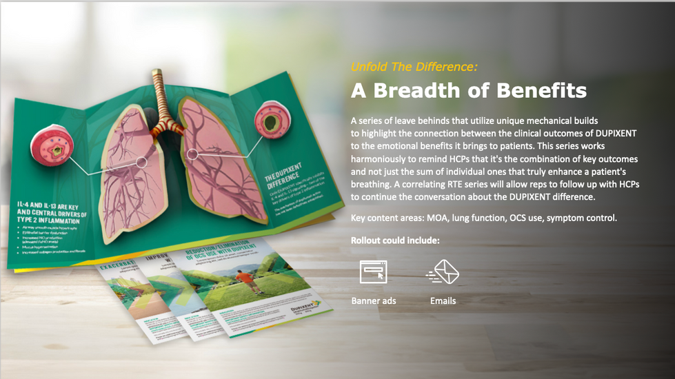 The Dupixent Difference is not just the relief we create in their lungs, but the relief we manifest in their hearts and minds. DUPIXENT is the only biologic that comprehensively controls type 2 inflammation. We make the impacts of this one-of-akind treatment clear by showcasing the emotional and clinical benefits together.